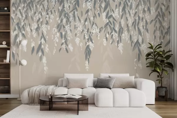 Valokuvatapetti Vaimean vihreän sävyisiä lehtien oksia, valkoisia kukkia ja lehtiä beigellä pohjalla Nr w08781