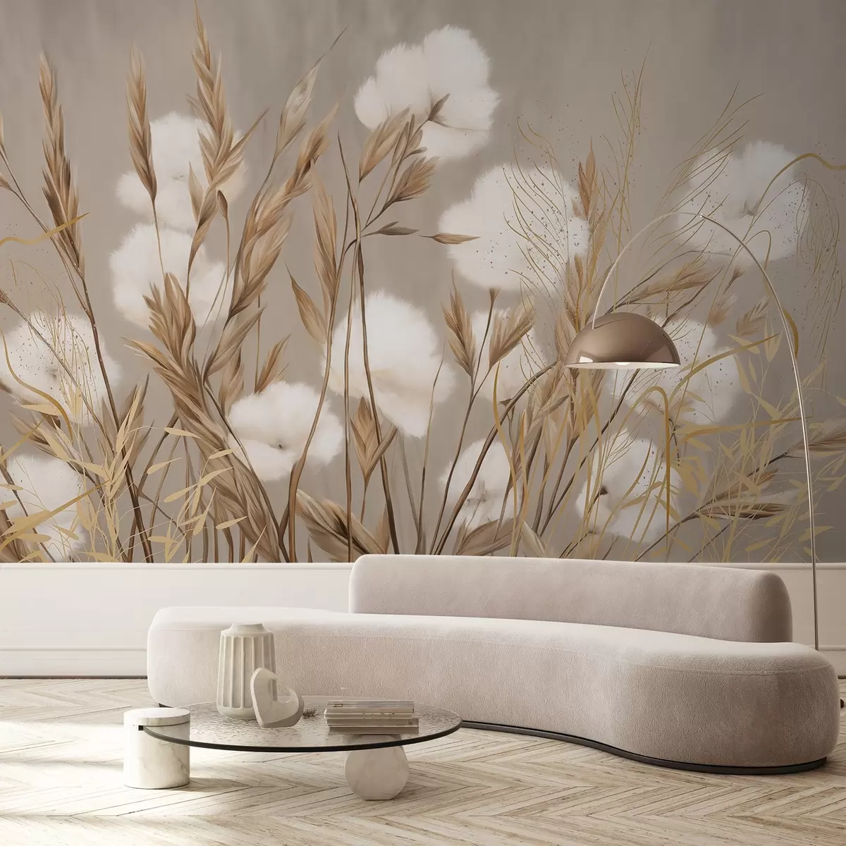 Valokuvatapetti Pehmeä, pörröinen puuvilla valkoisia kukkia ja korkeita oransseja ruohon tähkylöitä beigeä taustaa vasten Nr w08784