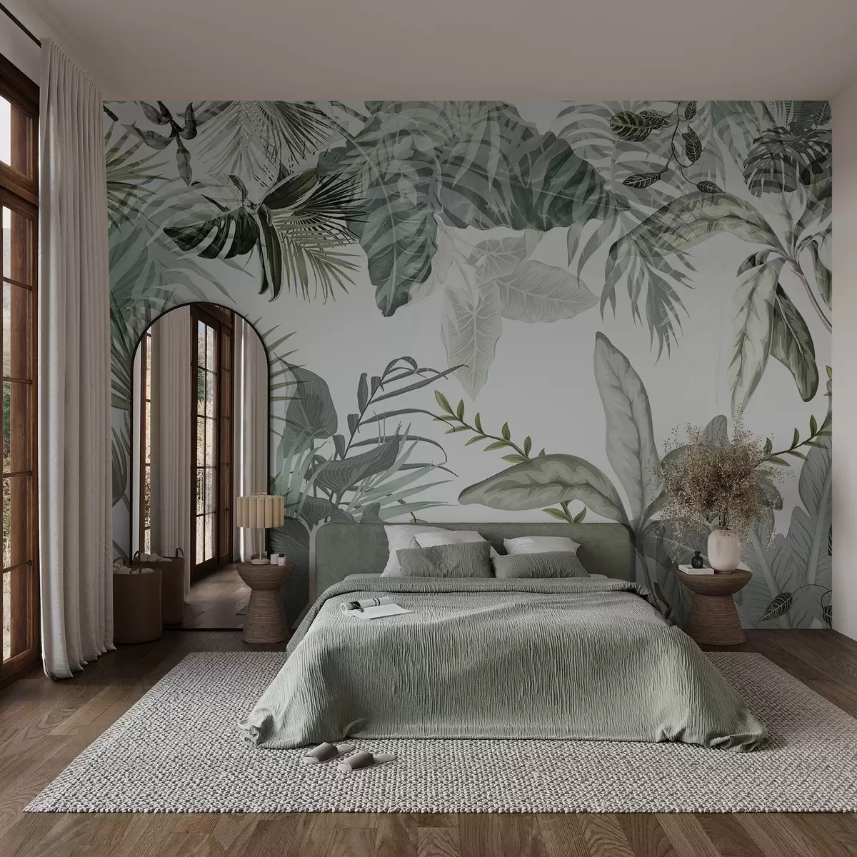 Valokuvatapetti Läpinäkyvät trooppiset lehdet vihreän sävyissä valkoisella pohjalla Nr w08822