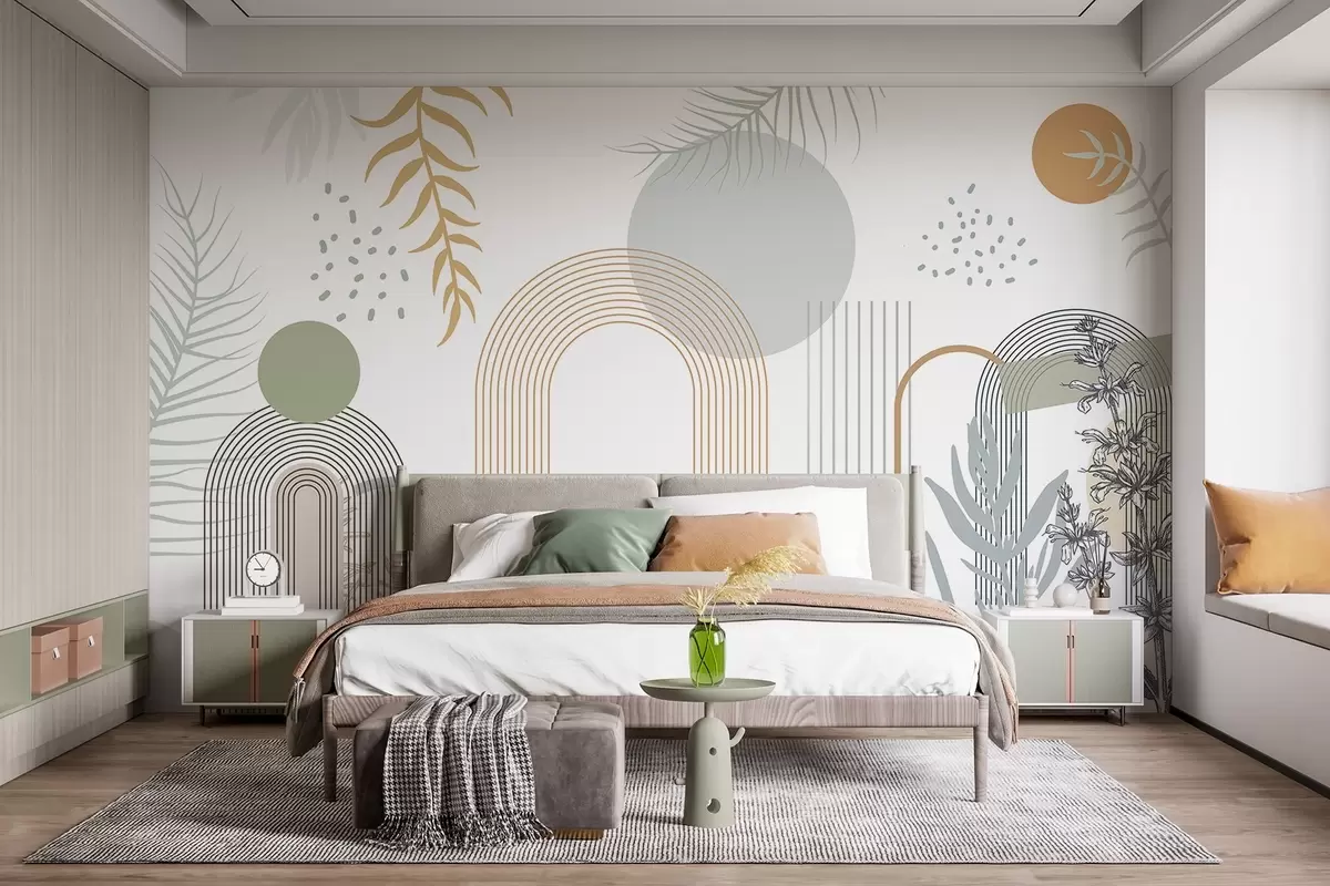 Valokuvatapetti Abstrakti tuloste, jossa on geometrisia muotoja, kaaria ja trooppisia lehtiä valkoisella pohjalla Nr w08835