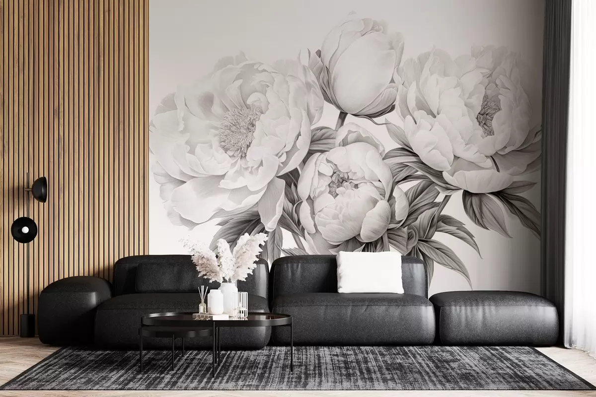 Valokuvatapetti Mustavalkoiset pionit lyijykynäpiirustuksen tyyliin Nr w08852