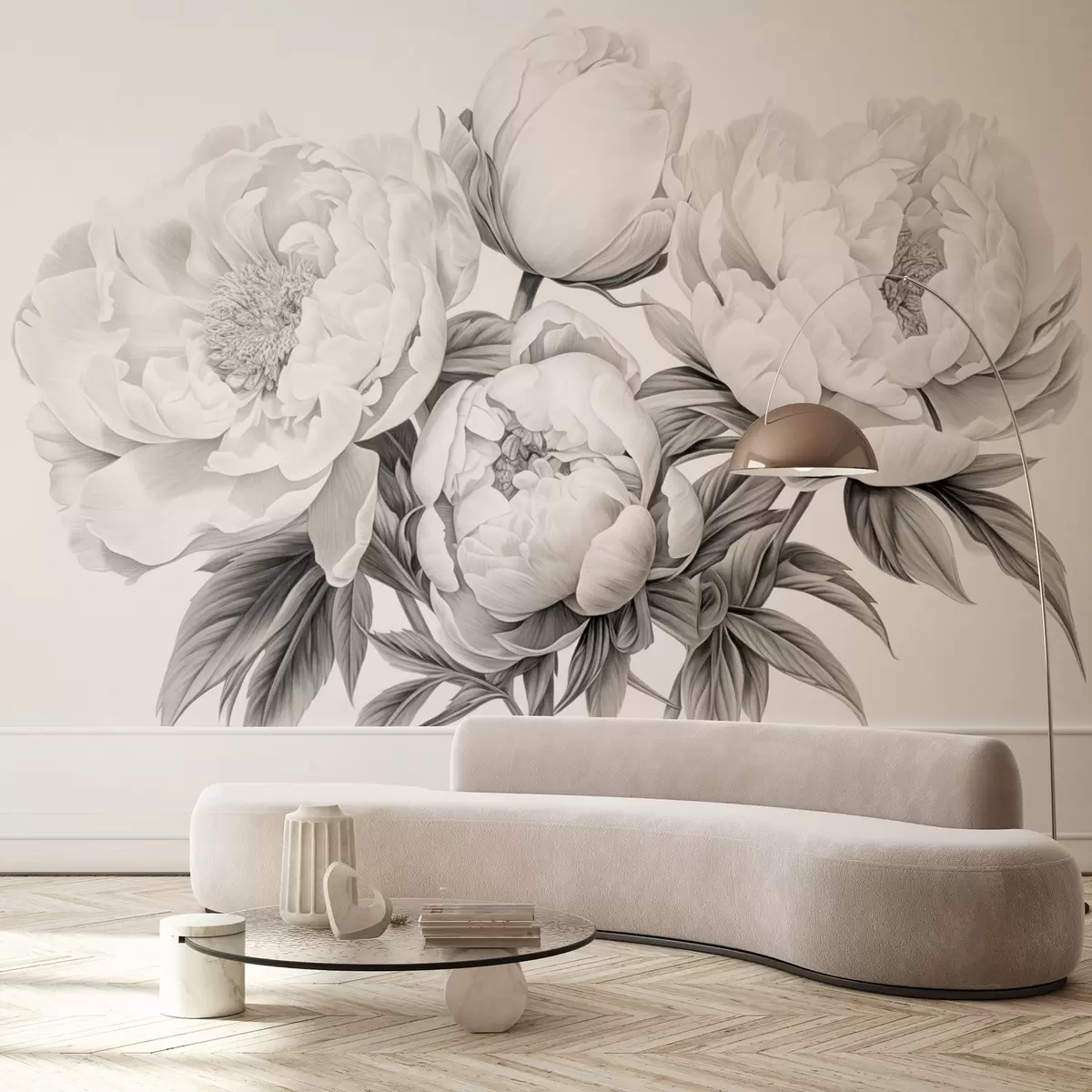 Valokuvatapetti Mustavalkoiset pionit lyijykynäpiirustuksen tyyliin Nr w08852