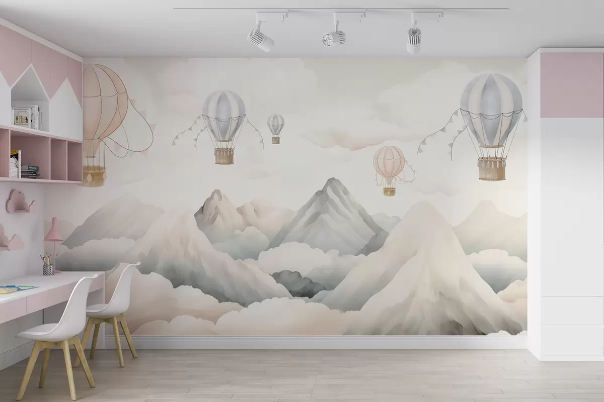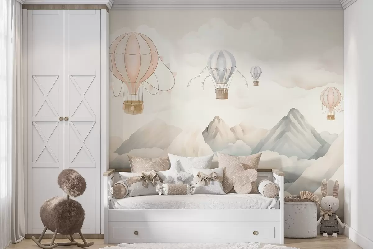Valokuvatapetti Kuumailmapallot leijuvat vuorten yllä neutraaleissa, pehmeissä pastellisävyissä sävyissä Nr w08853