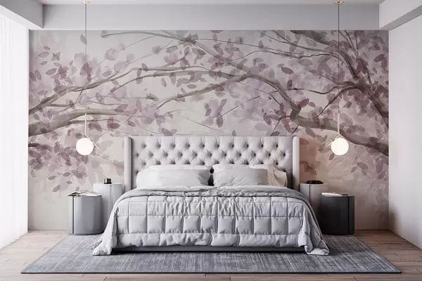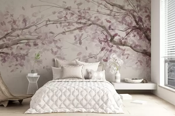 Valokuvatapetti Kukkien oksat ja vaaleanpunaiset lehdet, pehmeät värit, herkät yksityiskohdat, akvarellityyli, vaaleaa taustaa vasten Nr w08867