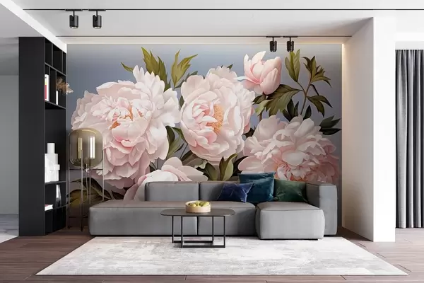 Valokuvatapetti Pehmeä vaaleanpunainen pionit lehdet sinisellä taustalla Nr w08882