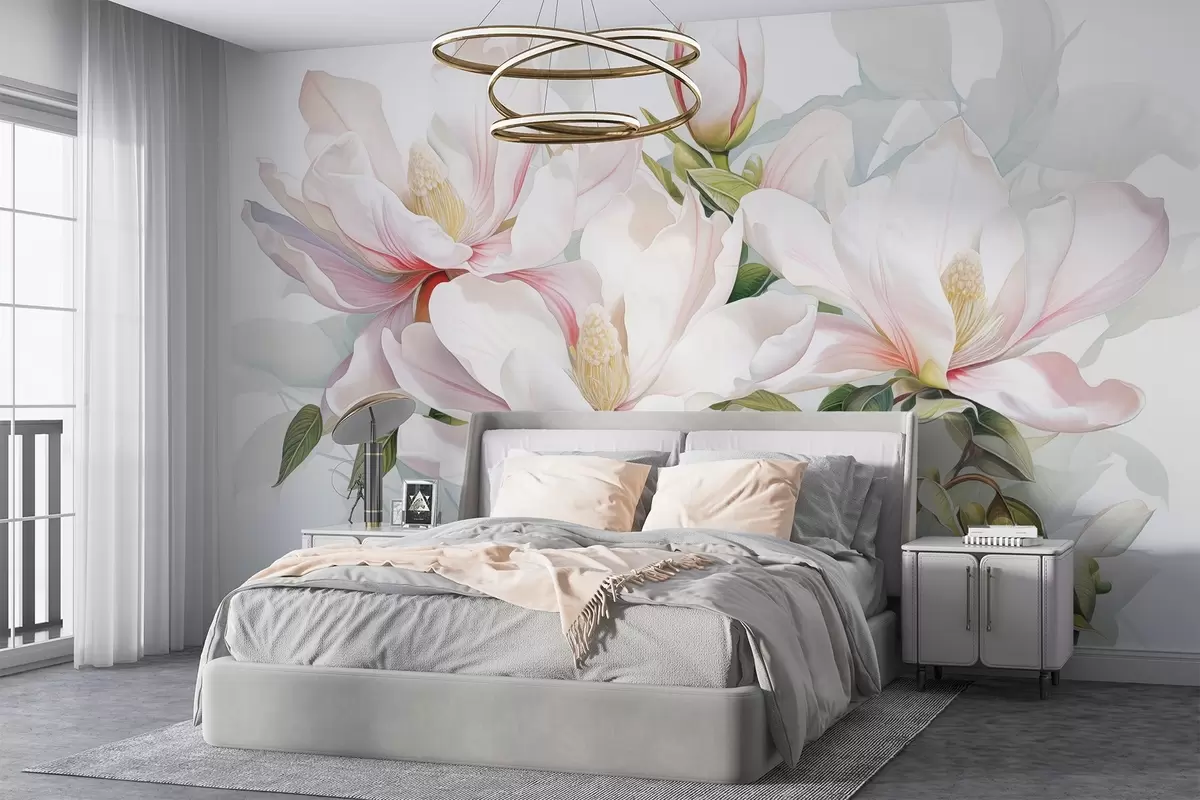 Valokuvatapetti Magnolian kukkia valkoisilla ja vaaleanpunaisilla terälehdillä, lehdillä ja ruskeilla oksilla, pehmeä ja herkkä vesivärityyli Nr w08885