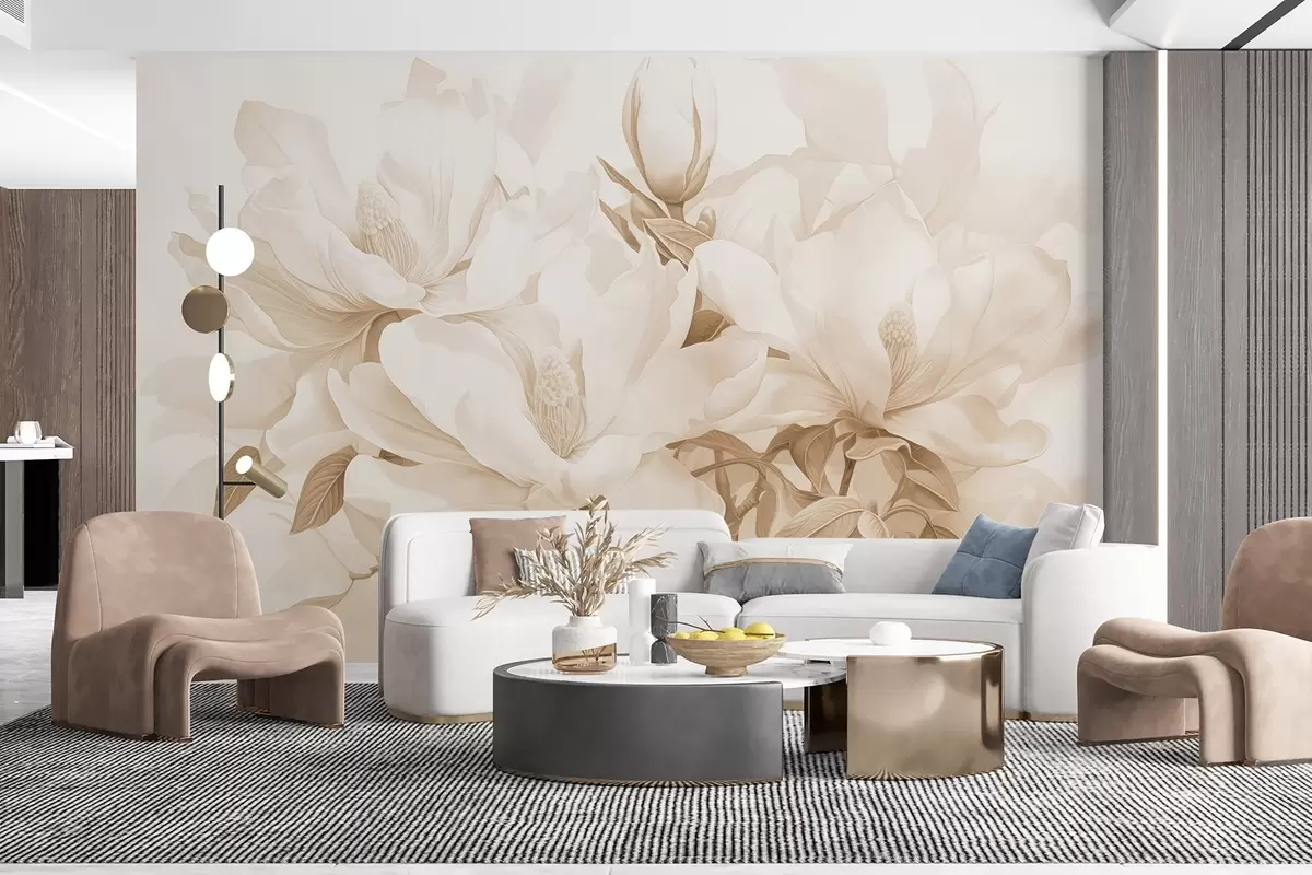Valokuvatapetti Magnolian kukkia, joissa on valkoisia ja beigejä terälehtiä, lehtiä ja ruskeita oksia, pehmeä ja herkkä akvarellivärityyli Nr w08886