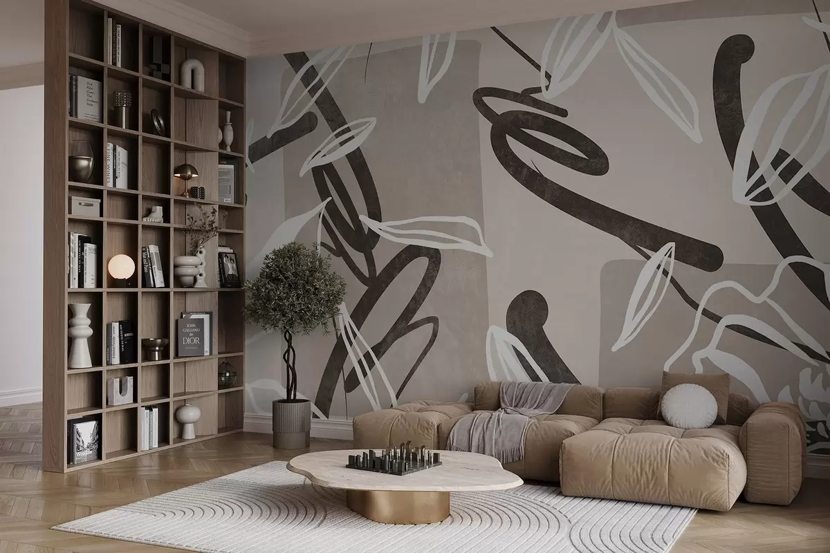 Valokuvatapetti Abstrakti kuvioitu moderni ja minimalistinen muotoilu, jossa on kukkaelementtejä neutraalissa beigen värimaailmassa Nr w08888