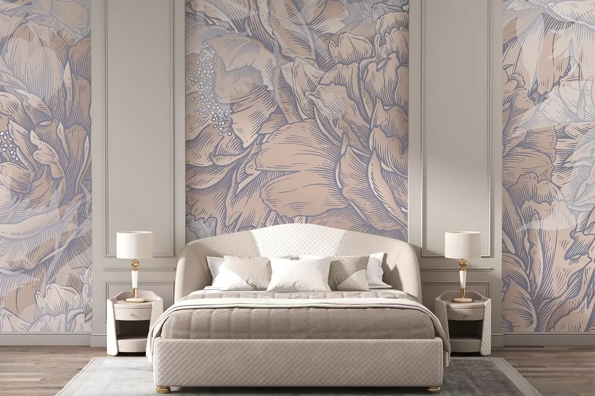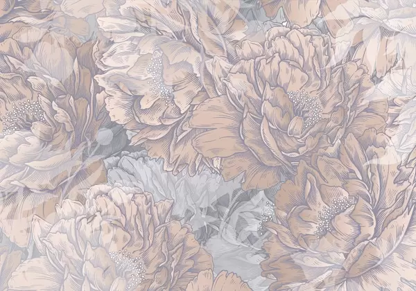 Valokuvatapetti Pionin kukkia, joissa on yksityiskohtaiset terälehdet ja heteet, pehmeät pastellivärit, vintage kasvitieteellinen kuvitustyyli Nr w08890