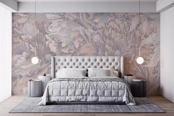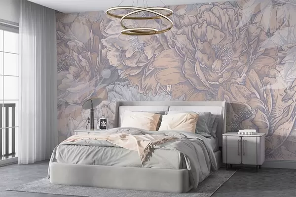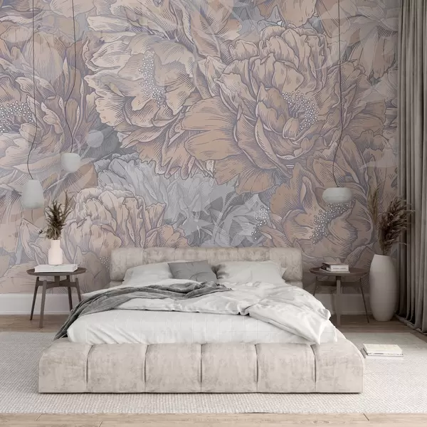 Valokuvatapetti Pionin kukkia, joissa on yksityiskohtaiset terälehdet ja heteet, pehmeät pastellivärit, vintage kasvitieteellinen kuvitustyyli Nr w08890