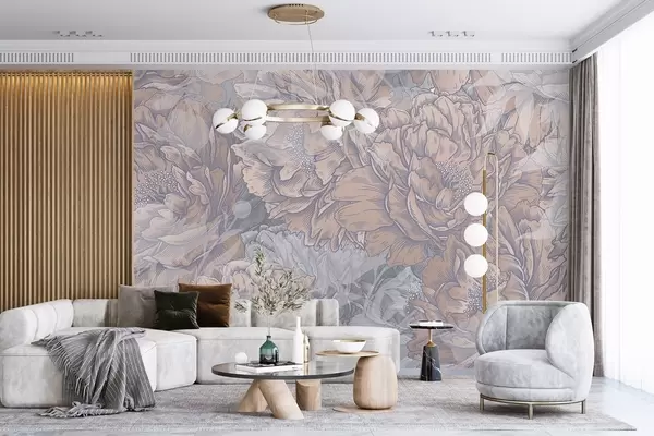 Valokuvatapetti Pionin kukkia, joissa on yksityiskohtaiset terälehdet ja heteet, pehmeät pastellivärit, vintage kasvitieteellinen kuvitustyyli Nr w08890