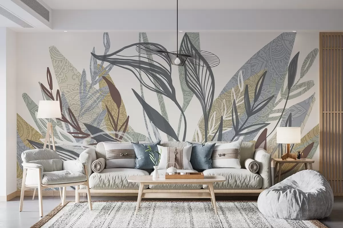 Valokuvatapetti Kokoelma erivärisiä ja erikokoisia lehtiä, joissa osassa on viivataidetta, valkoisella pohjalla Nr w08893