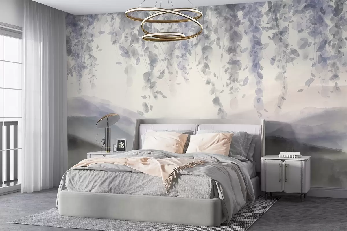 Valokuvatapetti Wisteria lehdet roikkuu yli sininen vuoret, pehmeä pastelli sininen ja harmaa värit, akvarelli tyyli maisema Nr w08909