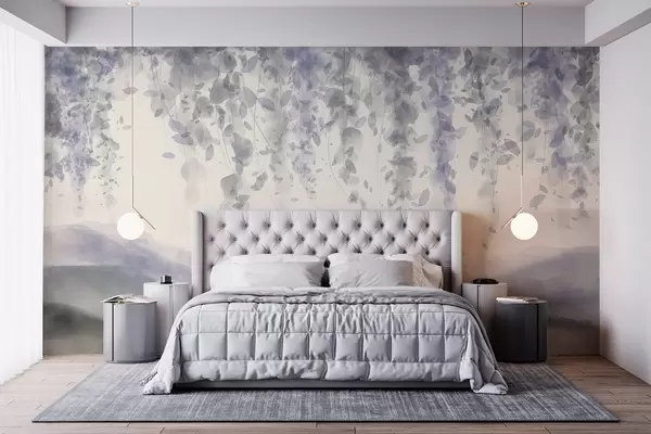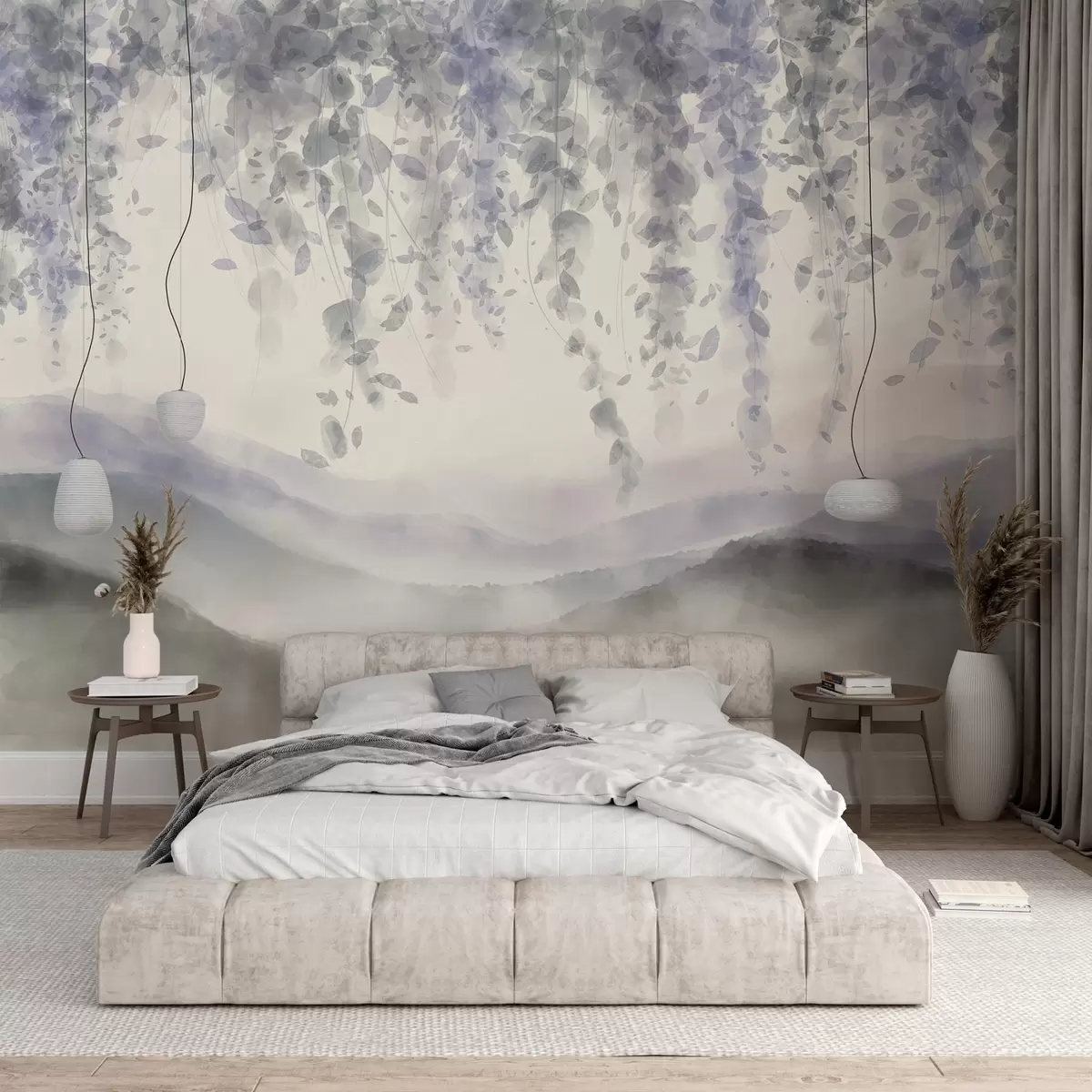 Valokuvatapetti Wisteria lehdet roikkuu yli sininen vuoret, pehmeä pastelli sininen ja harmaa värit, akvarelli tyyli maisema Nr w08909