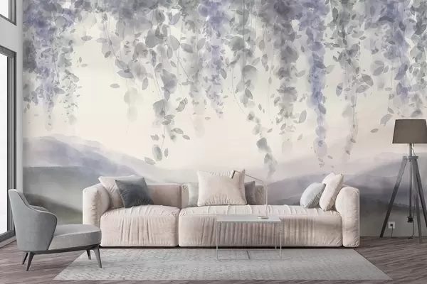 Valokuvatapetti Wisteria lehdet roikkuu yli sininen vuoret, pehmeä pastelli sininen ja harmaa värit, akvarelli tyyli maisema Nr w08909
