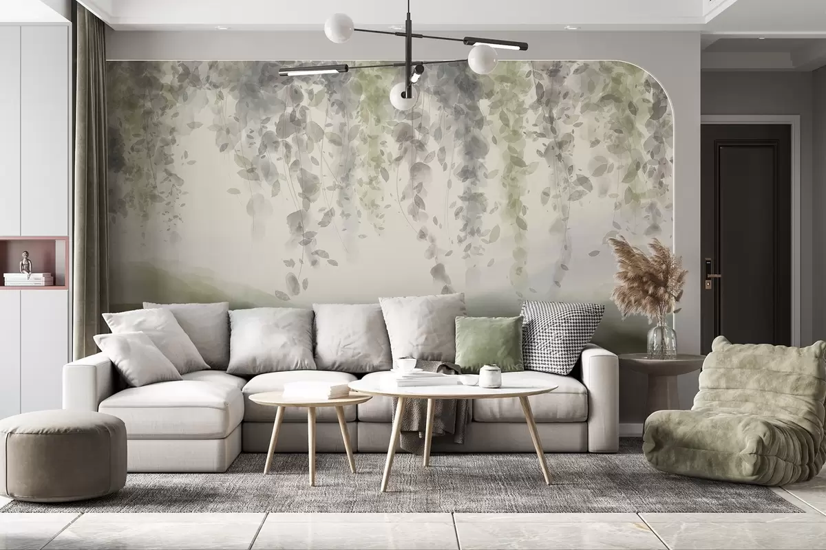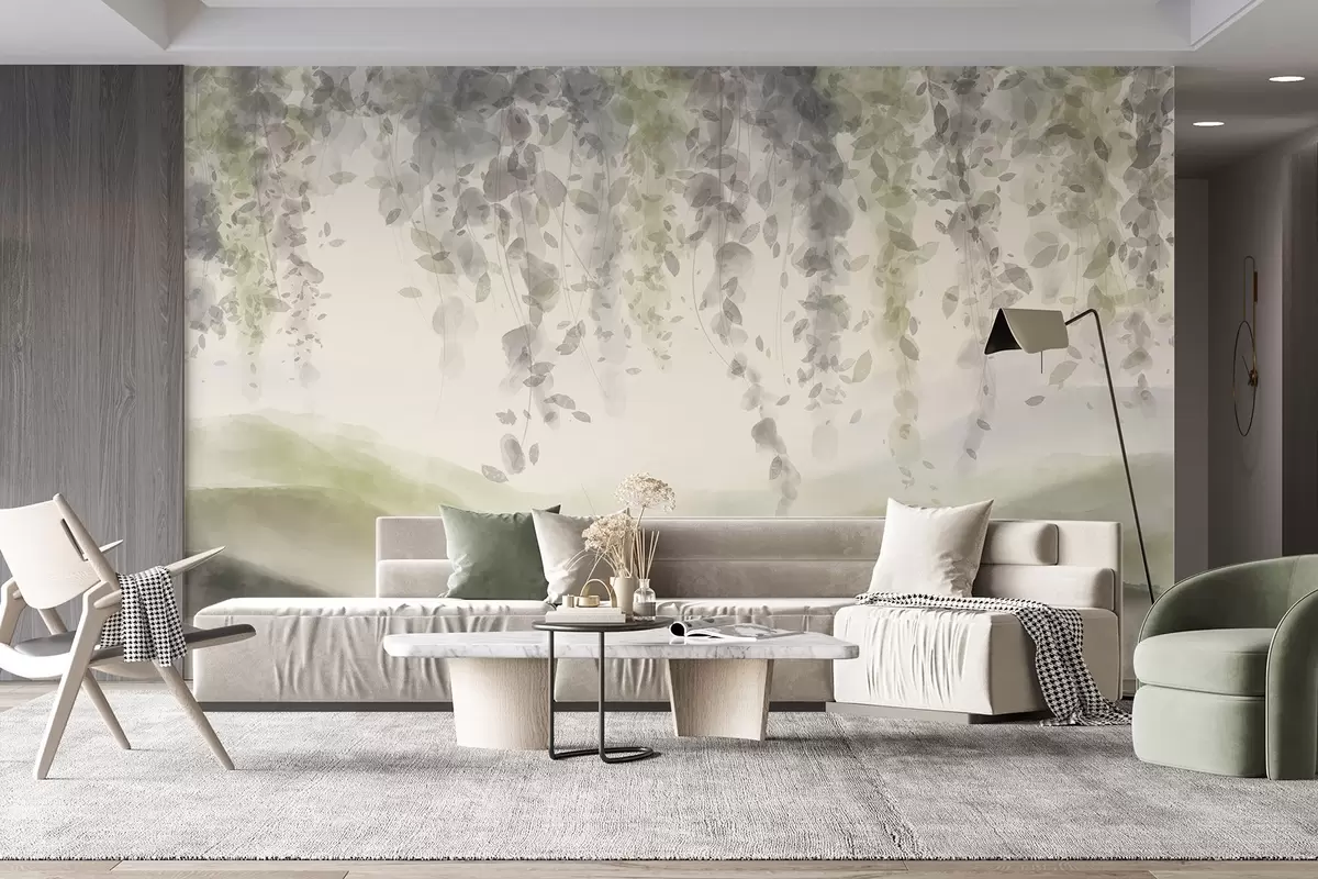 Valokuvatapetti Wisteria lehdet roikkuu yli sininen vuoret, pehmeä pastelli vihreä ja beige värit, akvarelli tyyli maisema Nr w08909v2