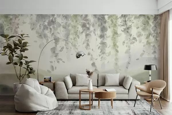 Valokuvatapetti Wisteria lehdet roikkuu yli sininen vuoret, pehmeä pastelli vihreä ja beige värit, akvarelli tyyli maisema Nr w08909v2
