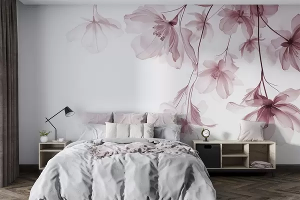 Valokuvatapetti Vaaleanpunaisia kukkia, joiden läpikuultavat terälehdet roikkuvat oksalla, vaaleanpunainen ja valkoinen, minimalistinen moderni taide sommitelma Nr w08911v2