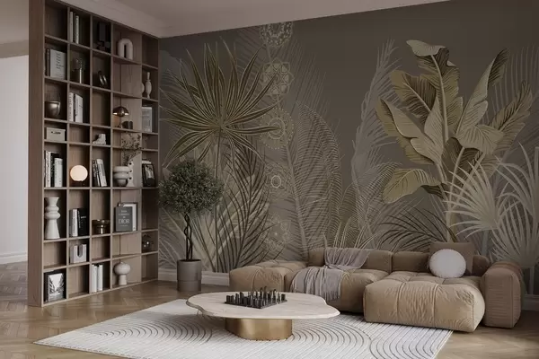 Valokuvatapetti Trooppisia lehtiä beigen ja ruskean sävyissä, palmunlehtiä, banaaninlehtiä ja mandala-koristeita, tumma tausta Nr w08913v1