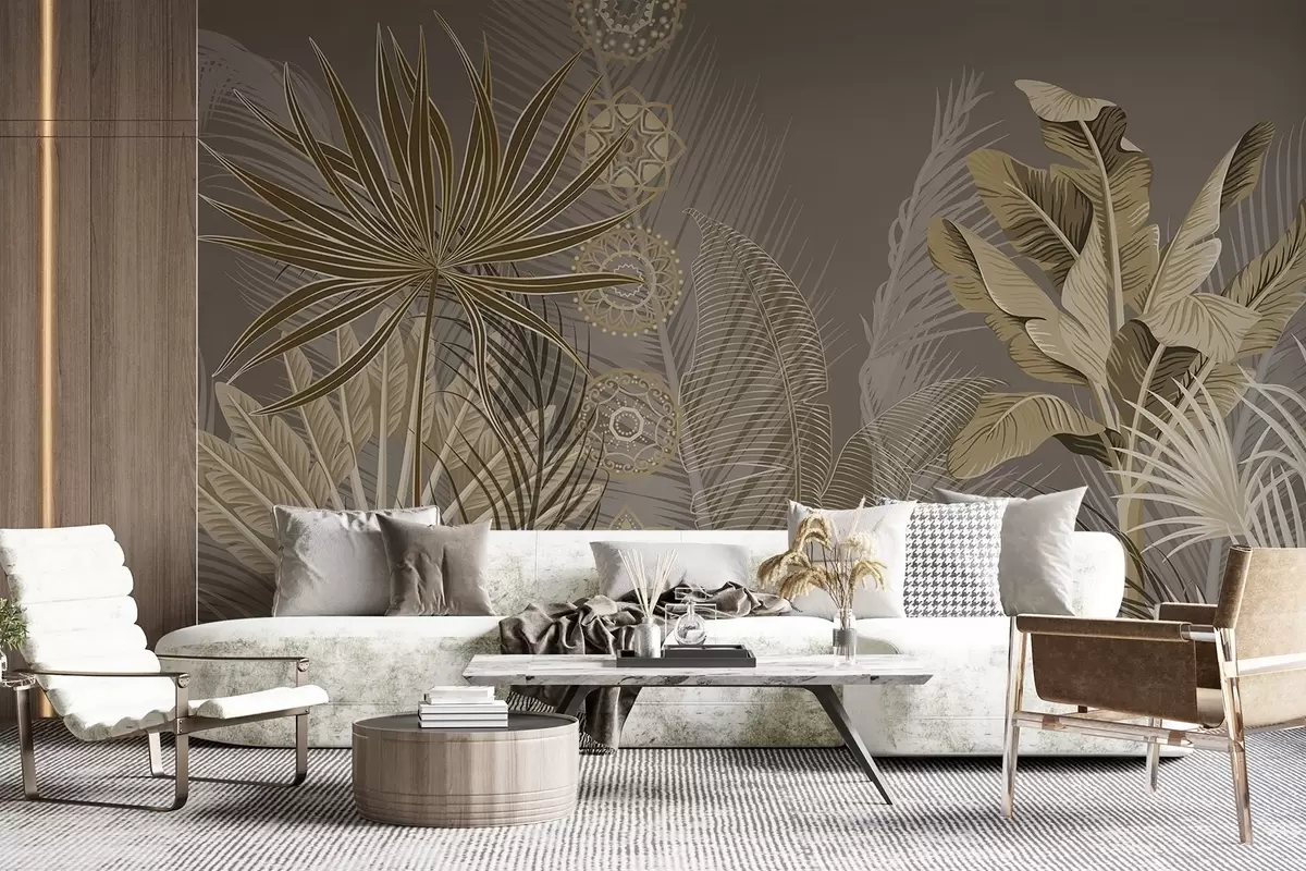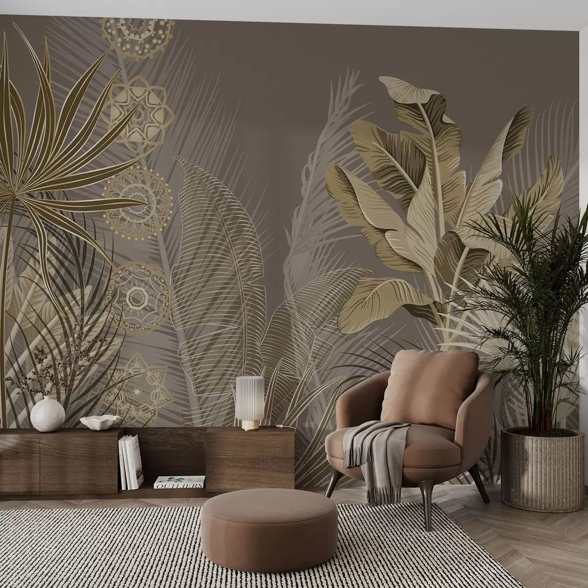 Valokuvatapetti Trooppisia lehtiä beigen ja ruskean sävyissä, palmunlehtiä, banaaninlehtiä ja mandala-koristeita, tumma tausta Nr w08913v1