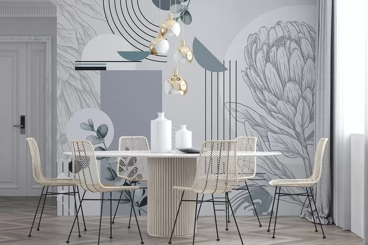 Valokuvatapetti Abstrakti kasvitieteellinen tuloste, jossa protea kukka, eukalyptus lehdet, geometriset muodot minimalistiseen tyyliin, pastellivärit Nr w08914v1