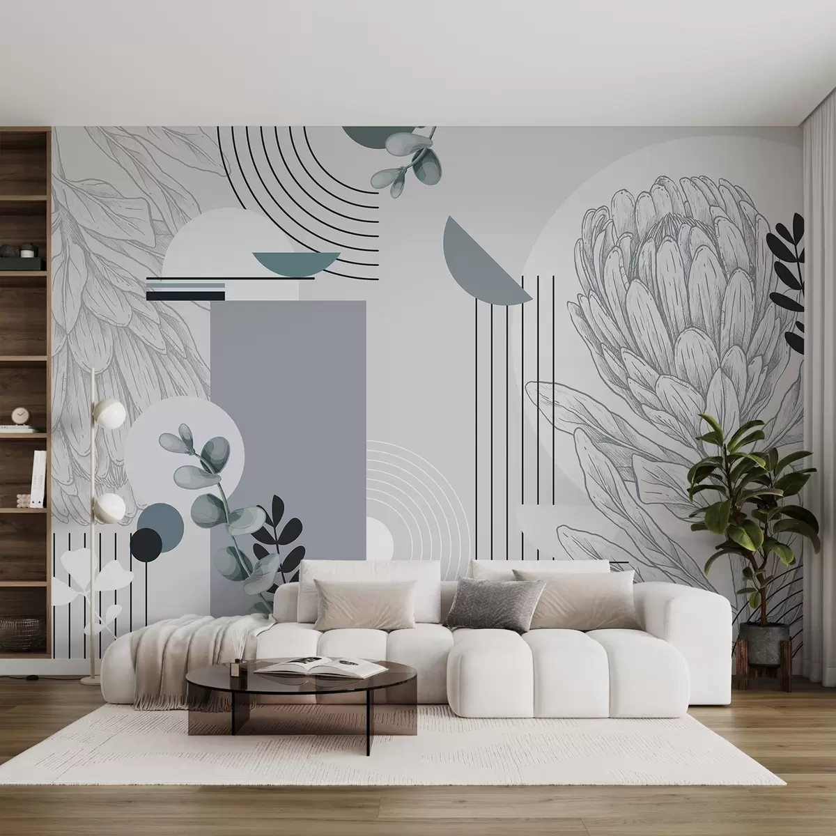 Valokuvatapetti Abstrakti kasvitieteellinen tuloste, jossa protea kukka, eukalyptus lehdet, geometriset muodot minimalistiseen tyyliin, pastellivärit Nr w08914v1