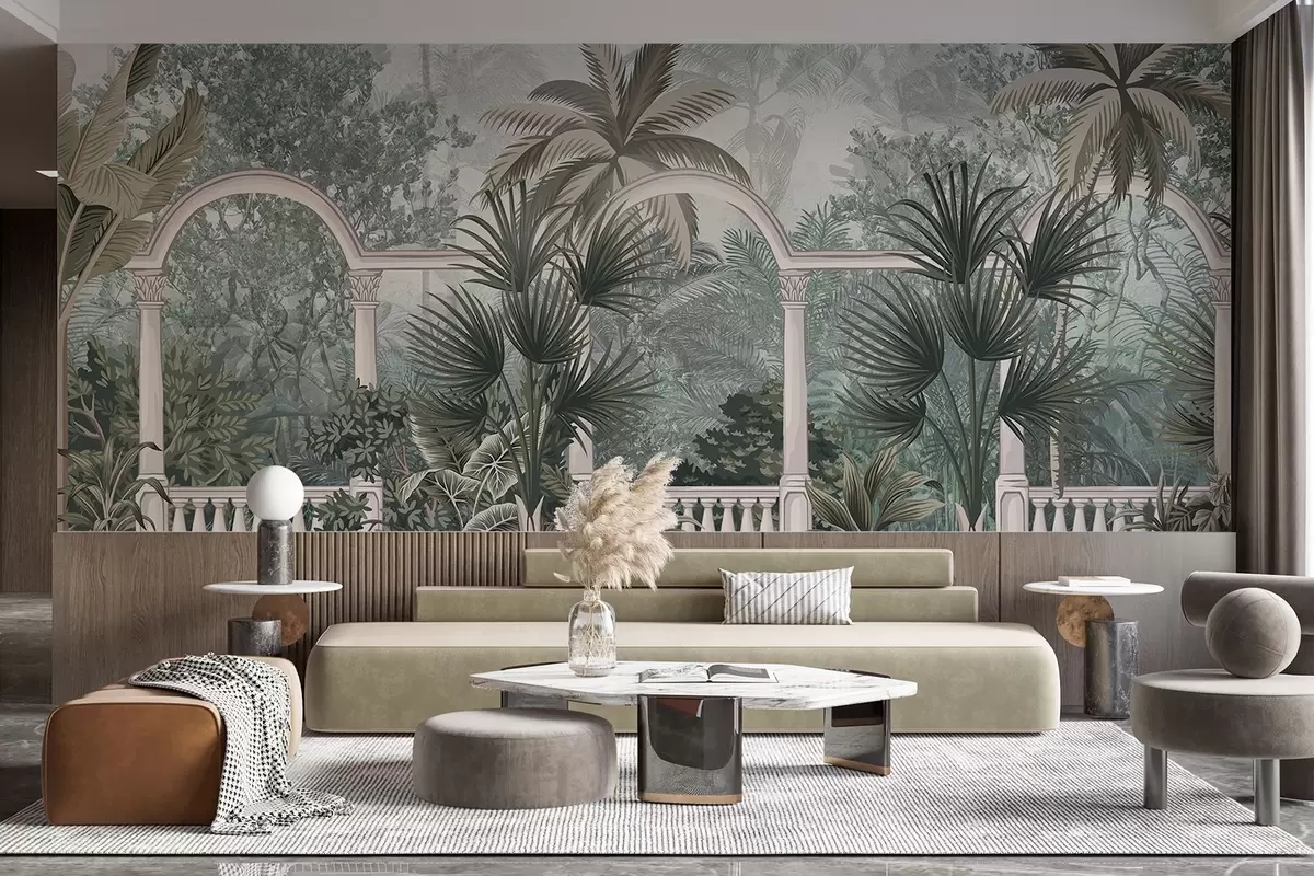 Valokuvatapetti Trooppinen kuvioitu puutarha, jossa palmuja ja rehevää kasvillisuutta, kaide kaaria, hillityt värit, vintage-tyyliin Nr w08916