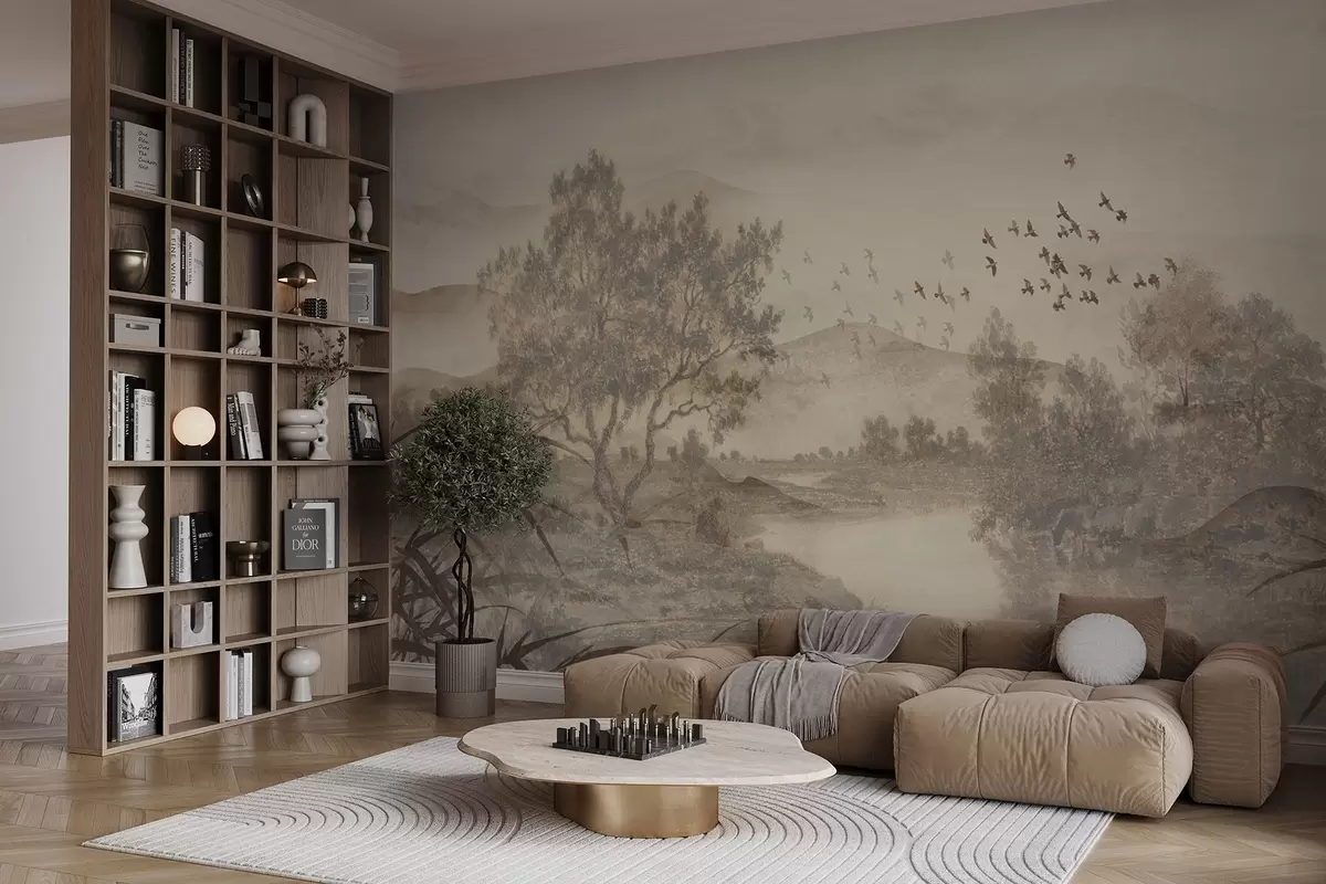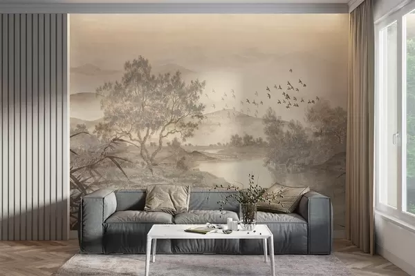 Valokuvatapetti Teksturoitu vintage maisema, jossa puu lähellä jokea ja pilvinen taivas, luontotaidetta seepian sävyissä Nr w08920