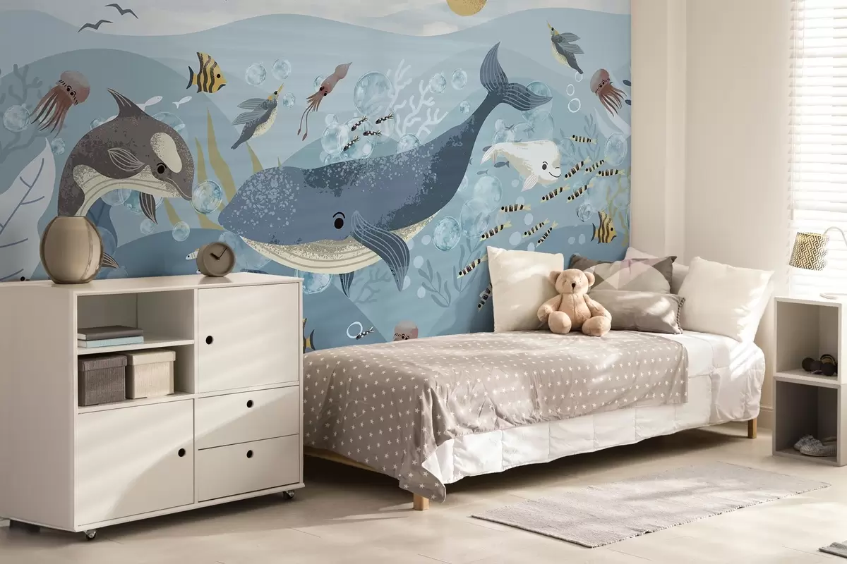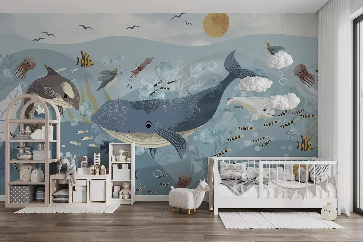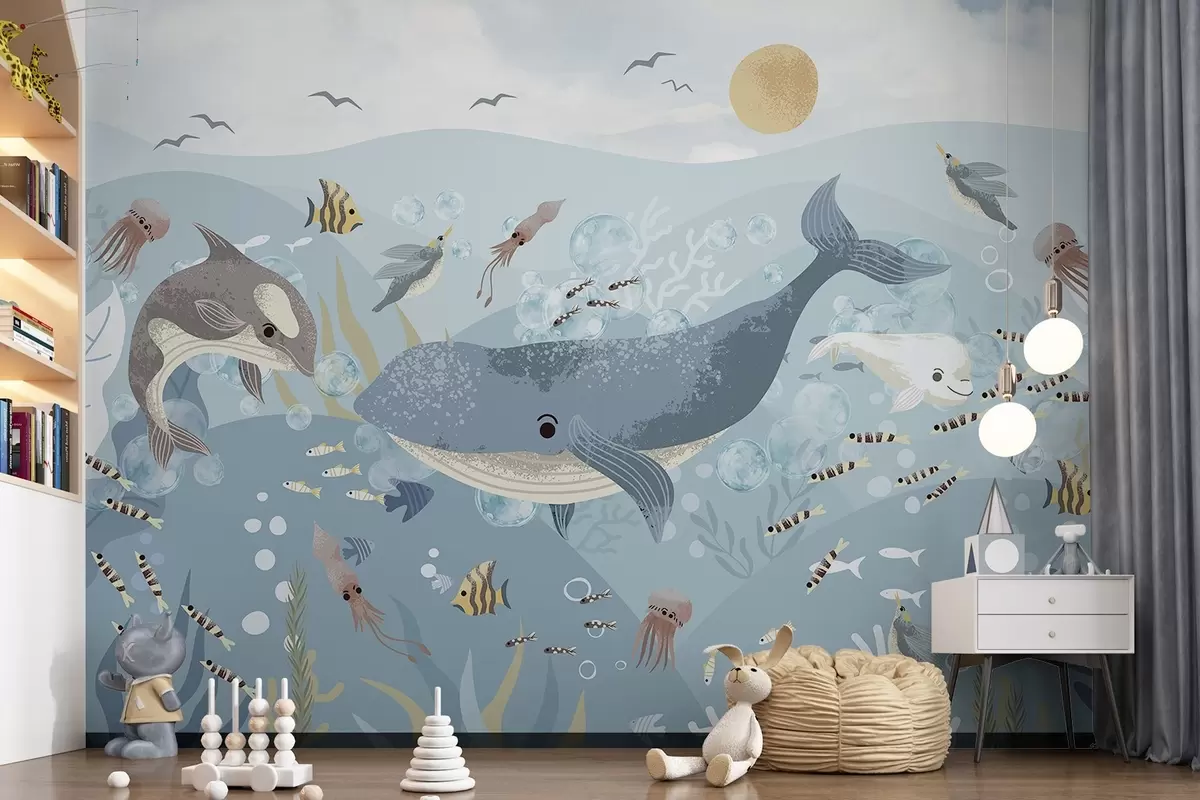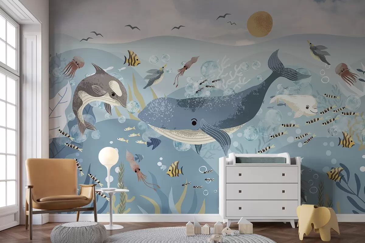 Valokuvatapetti Lapset kuvitus söpö tulostaa sininen valas ympäröi kaloja, squids, meduusa sininen valtameri kuplia Nr w08921
