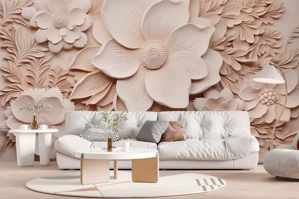 Valokuvatapetti Beigen väriset kukat ja lehdet, joissa on reliefi-efekti Nr w08933