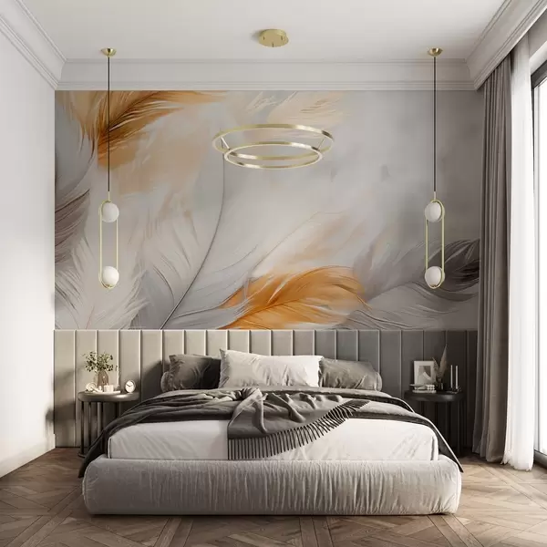 Valokuvatapetti Harmaat ja keltaiset höyhenet harmaalla pohjalla Nr w08937