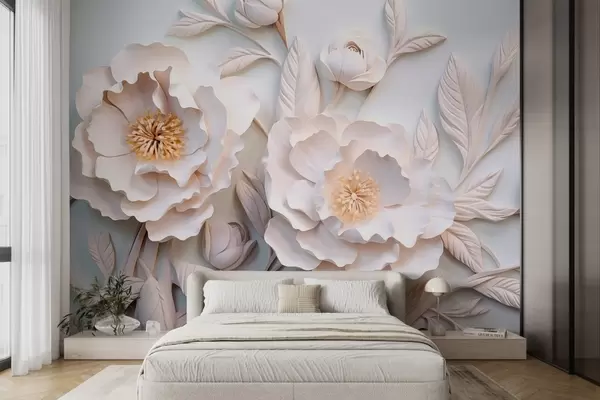 Valokuvatapetti 3D-reliefi pionit freskotyyliin keltaisella aksentilla Nr w08967