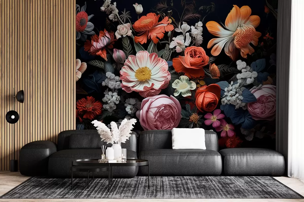 Valokuvatapetti Värikäs kimppu erilaisia kukkia tummalla taustalla viileillä sävyillä Nr w08969v1