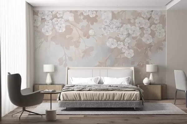 Valokuvatapetti Kirsikankukkien oksat, joissa on valkoisia kukkia ja harmaita lehtiä, tyylikkäissä kukkasilhueteissa pehmeissä pastellisissa väreissä Nr w08973