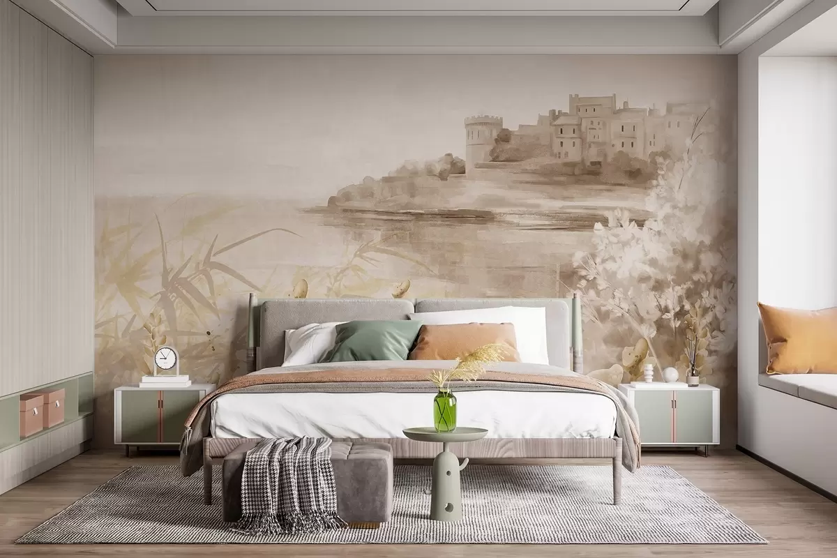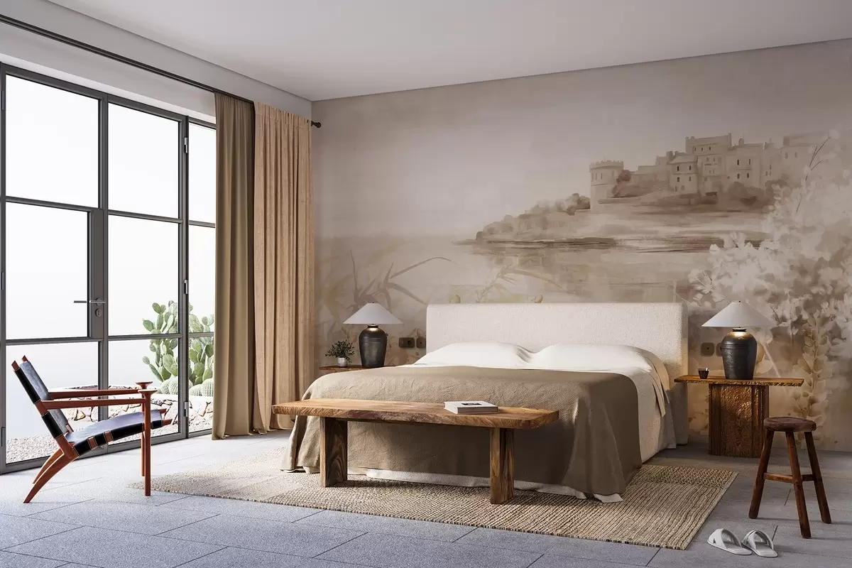 Valokuvatapetti Teksturoitu vintage maisema, jossa on linna kalliolla, josta on näkymät merelle, laventeli kukkia mykistetyissä väreissä Nr w08975v1