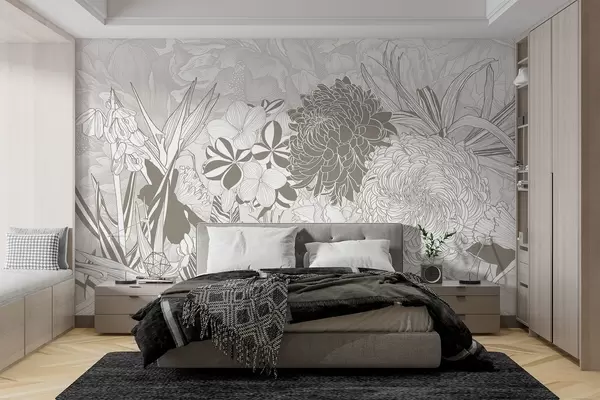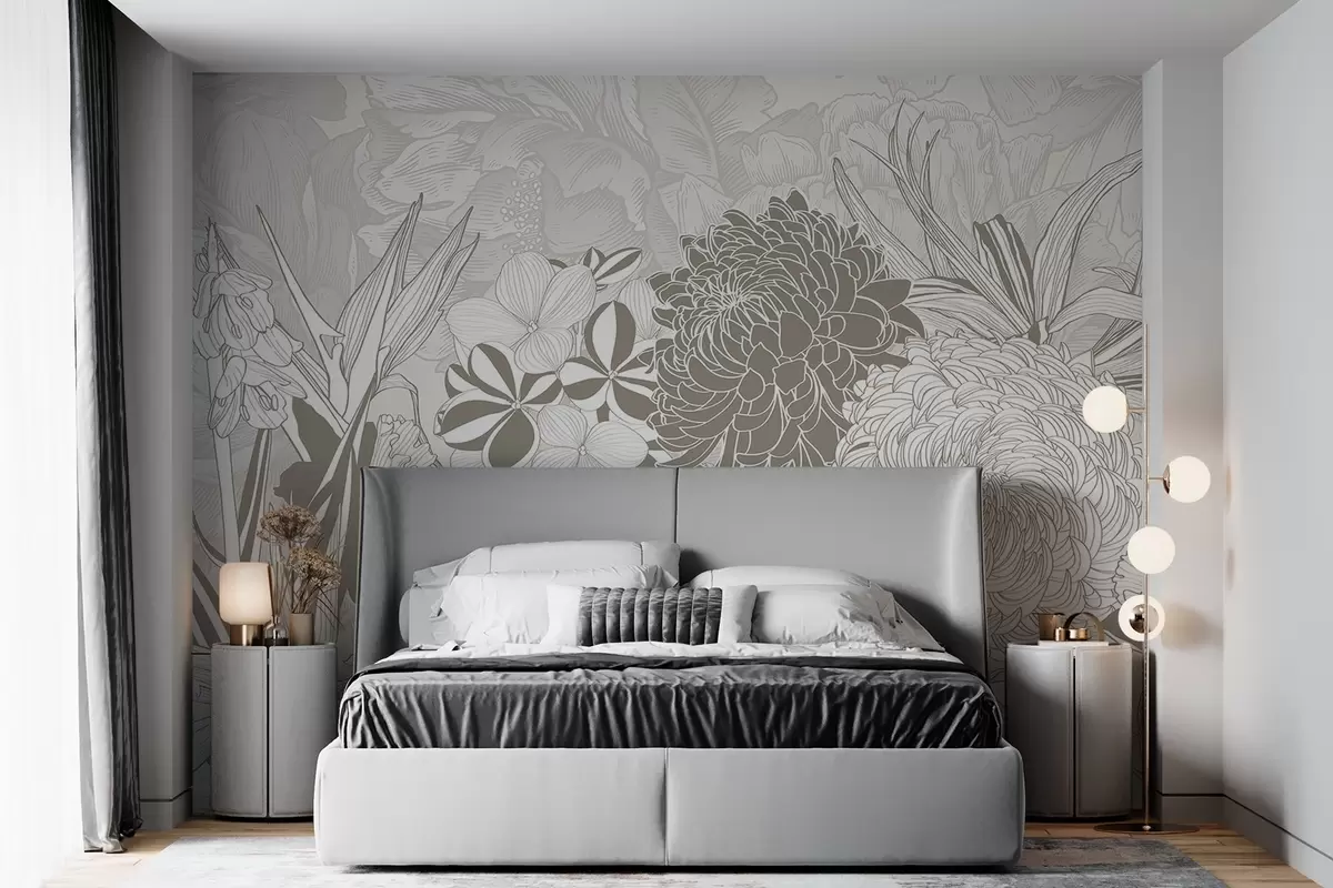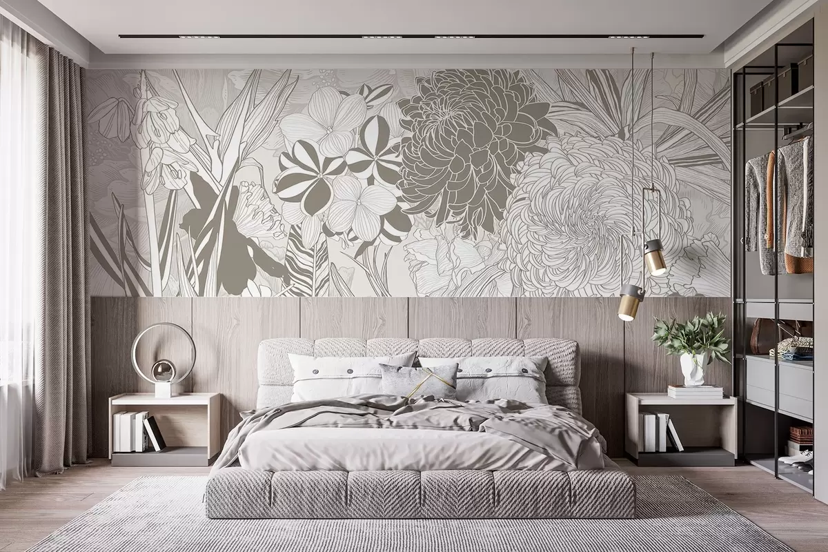 Valokuvatapetti Kukkia ja lehtiä beigen sävyissä, mukaan lukien krysanteemit, plumeria ja trooppiset lehdet, kasvitieteellinen muotoilu Nr w08976