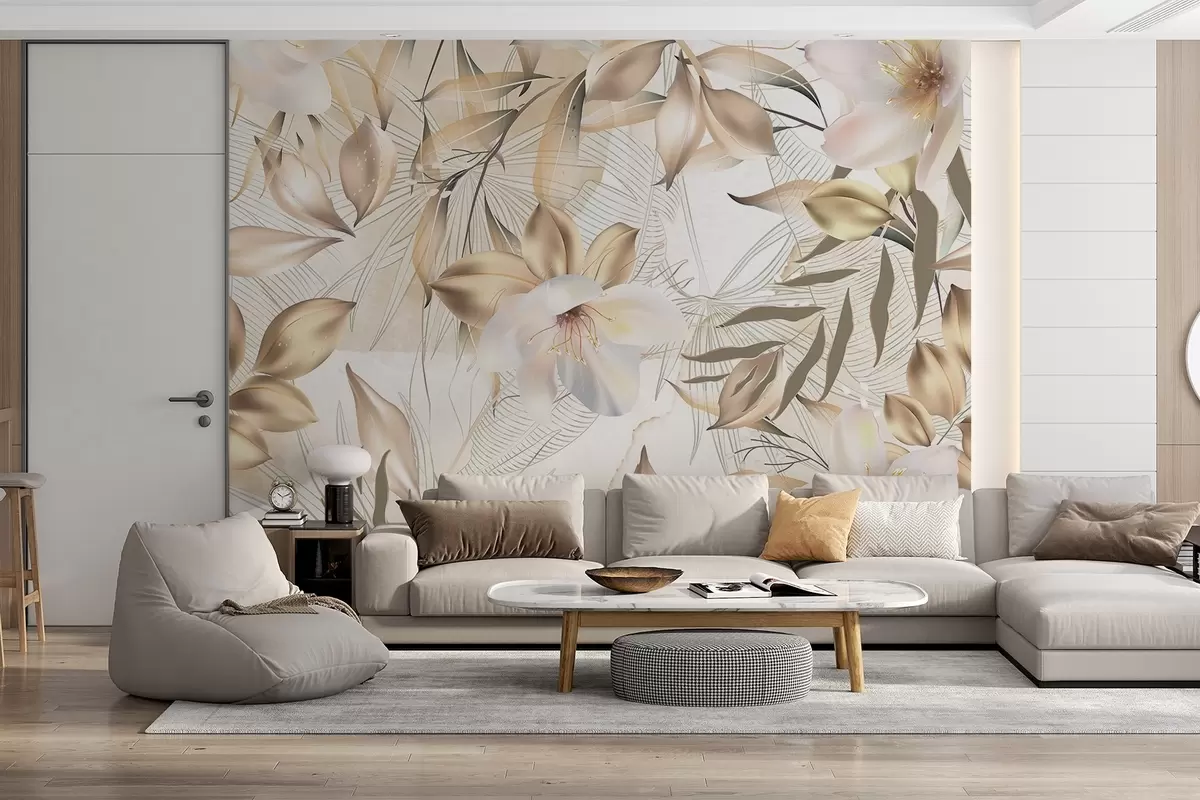 Valokuvatapetti Jasmiinin kukkia ja lehtiä, pehmeät värit, kasvitieteellinen kuvitus, kukka tausta , elegantti muotoilu, herkät terälehdet Nr w08977