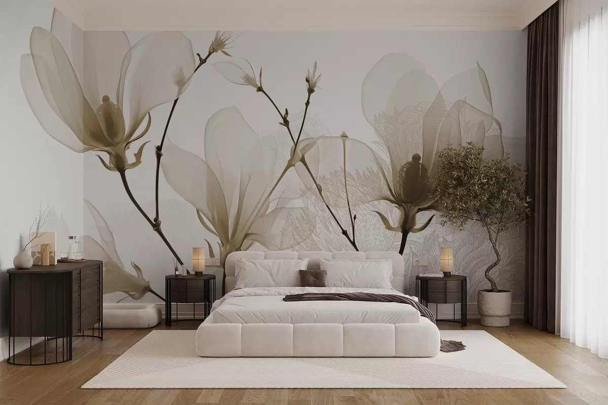 Valokuvatapetti Läpikuultava beige magnolia kukkia kukkia siluetteja kukkia herkkä terälehdet ja tumma varret Nr w08978v1