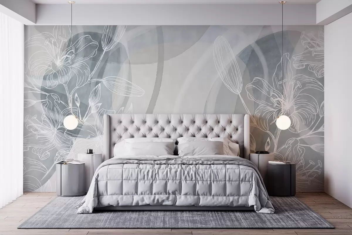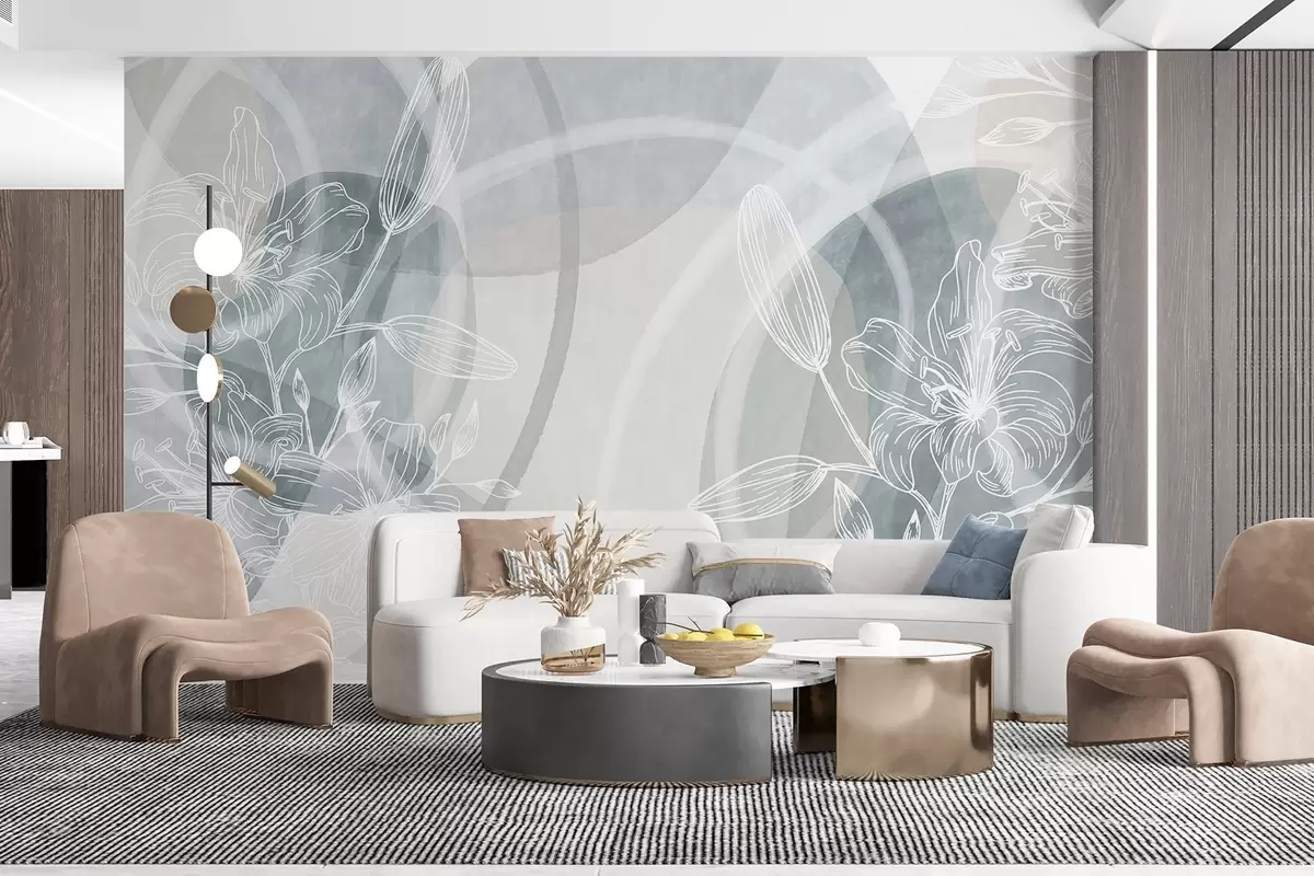 Valokuvatapetti Minimalistinen kukka suunnittelu valkoinen line art kukkia ja lehtiä, päällekkäisiä abstrakteja ympyröitä harmaan ja sinisen sävyjä Nr w08979