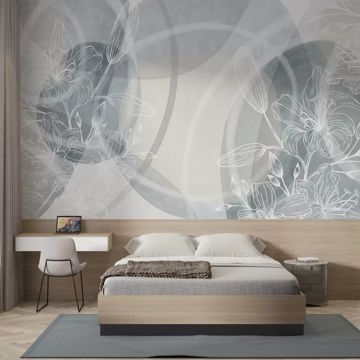 Valokuvatapetti Minimalistinen kukka suunnittelu valkoinen line art kukkia ja lehtiä, päällekkäisiä abstrakteja ympyröitä harmaan ja sinisen sävyjä Nr w08979