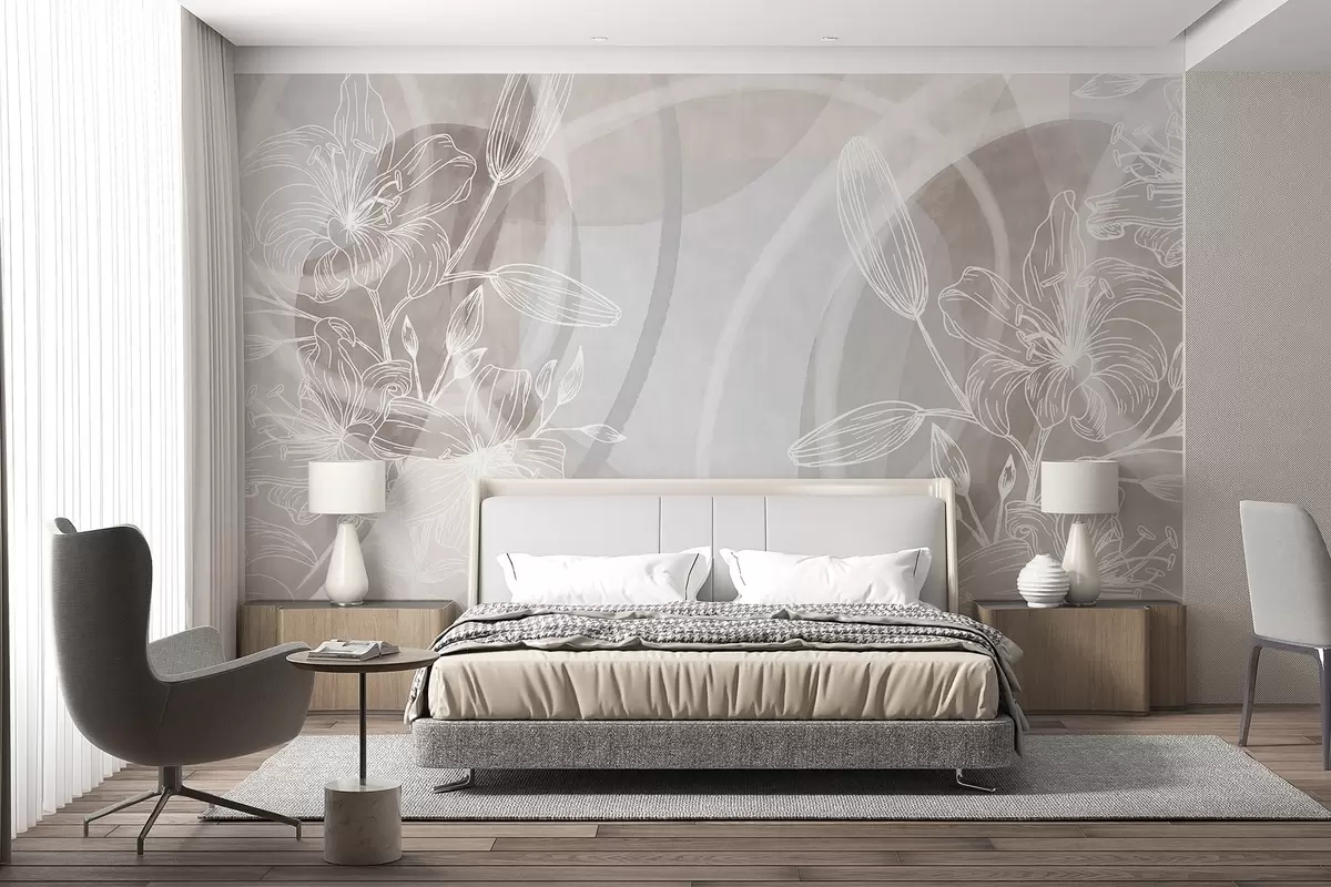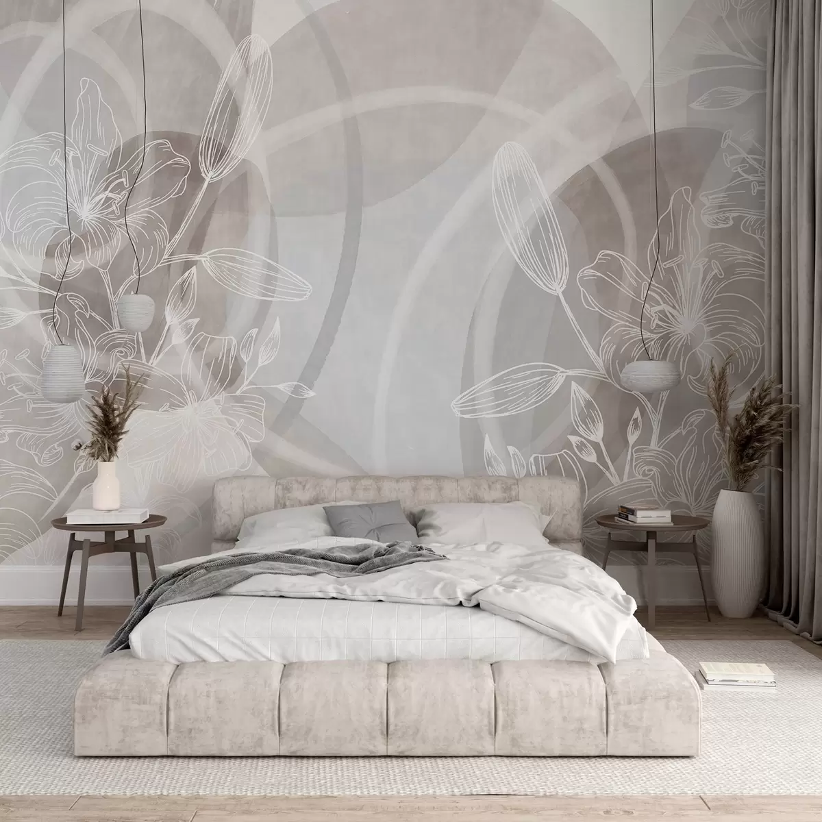 Valokuvatapetti Minimalistinen kukka suunnittelu valkoinen line art kukkia ja lehtiä, päällekkäisiä abstrakteja ympyröitä sävyjä beige ja sininen Nr w08979v1