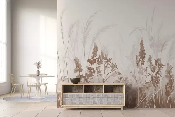 Valokuvatapetti Ruskeat kukat ja beige kaislikot pellolla, minimalistinen maalaus rakenne, kevyt tausta, pehmeät värit, herkkä siveltimenvedot Nr w08982v1