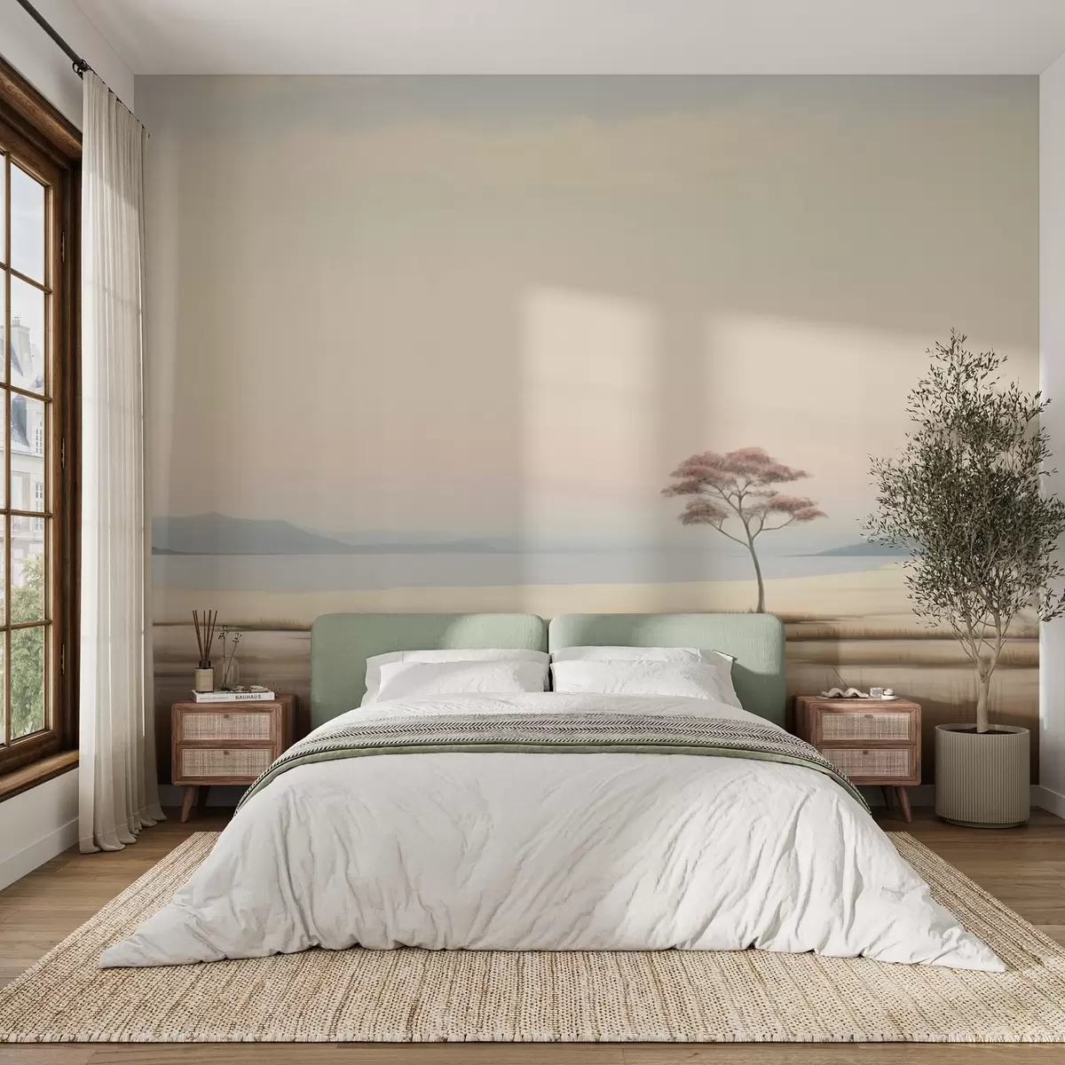 Valokuvatapetti Seesteinen maisema ja yksinäinen vaaleanpunainen puu Nr w08989