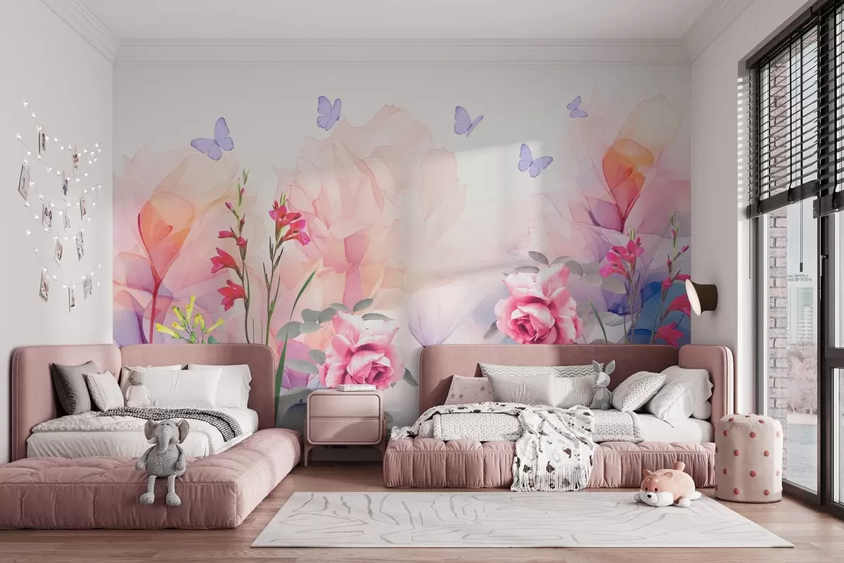 Valokuvatapetti Kukkia perhosia ja ruusuja vesivärityylillä Nr w09002