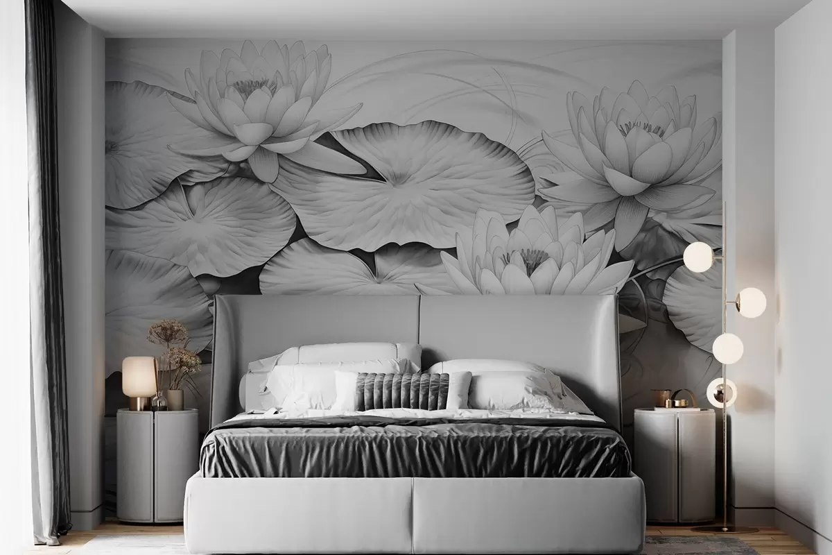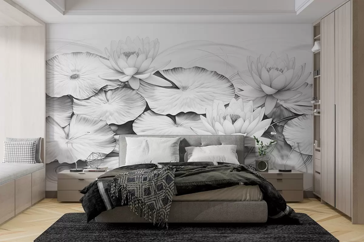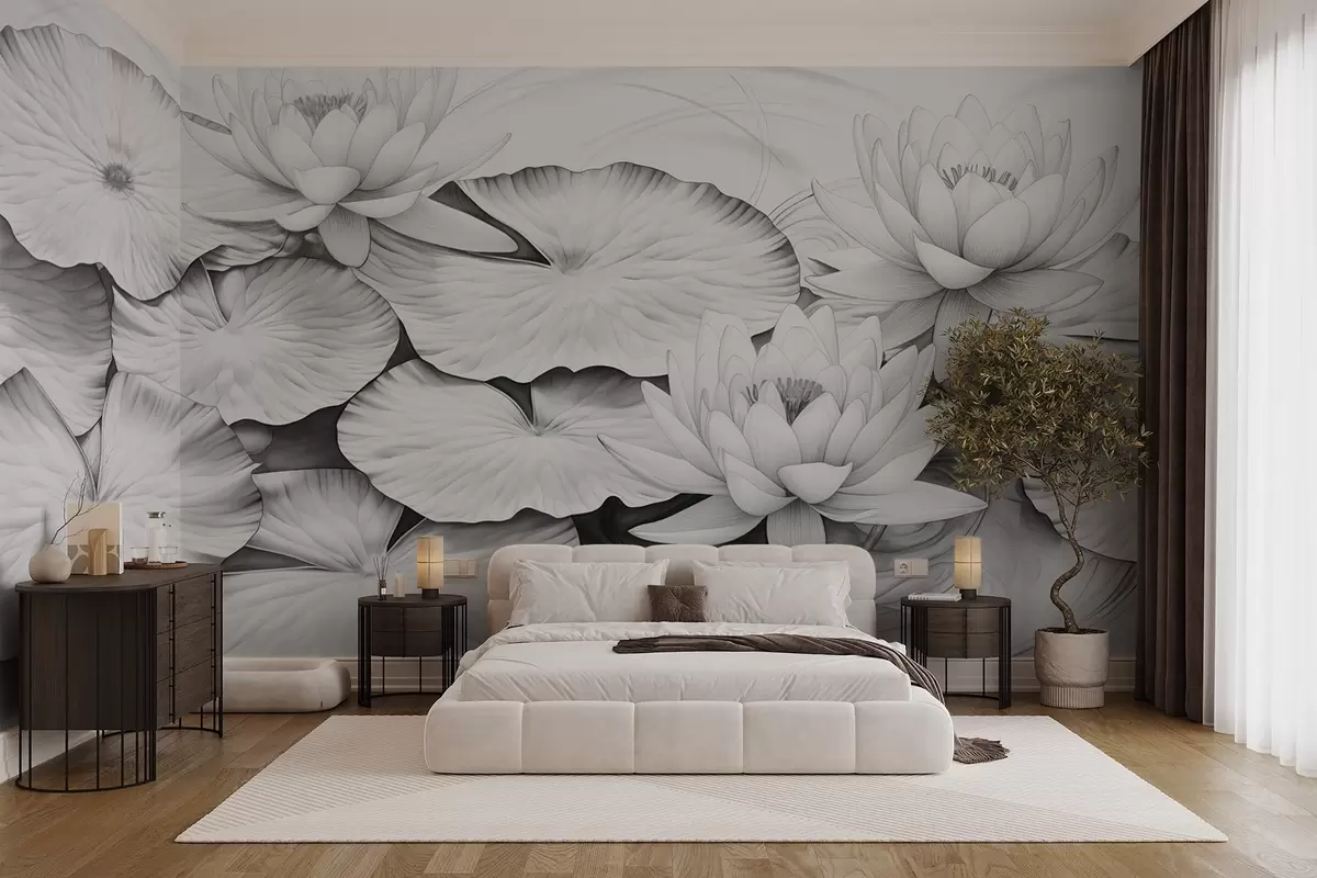 Valokuvatapetti Vesililjat ja liljatyynyt lammessa, mustavalkoinen jäljitelmä lyijykynäpiirroksesta, yksityiskohtainen kasvitieteellinen kuvitus, luontotaidetta Nr w09006