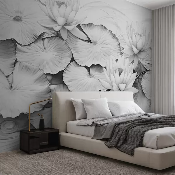 Valokuvatapetti Vesililjat ja liljatyynyt lammessa, mustavalkoinen jäljitelmä lyijykynäpiirroksesta, yksityiskohtainen kasvitieteellinen kuvitus, luontotaidetta Nr w09006