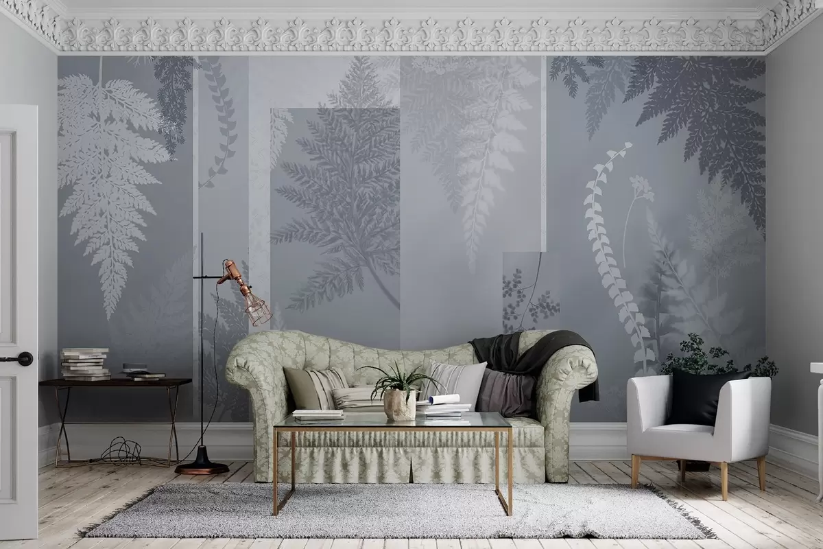 Valokuvatapetti Saniaisen lehdet sinistä ja valkoista, järjestetty pystysuoraan raidat, luoda kasvitieteellinen ja minimalistinen tulostaa, pehmeä ja hillitty värit Nr w09007v1