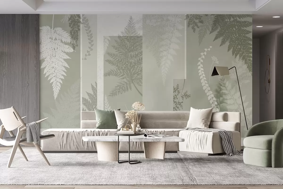 Valokuvatapetti Saniaisen lehdet vihreinä ja valkoisina, jotka on järjestetty pystyraidoittain, luoden kasvitieteellisen ja minimalistisen tulosteen, pehmeät ja hillityt värit Nr w09007v2