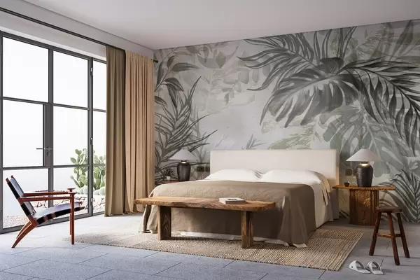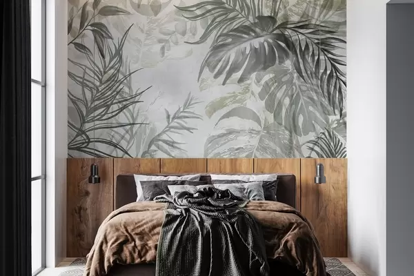 Valokuvatapetti Monstera ja palmunlehdet vihreän ja harmaan sävyissä, kasvitieteellinen, trooppiset lehdet, viidakkokasvit, kuvioitu tausta Nr w09011