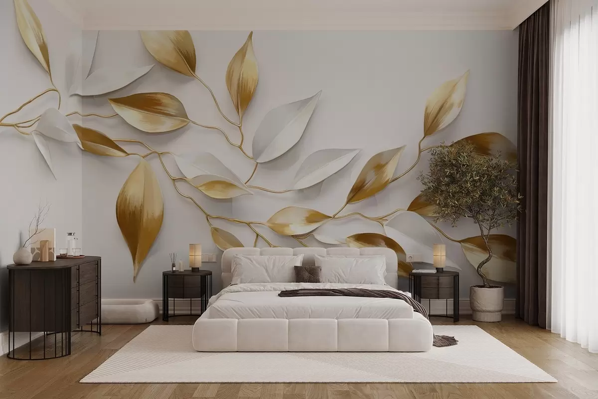Valokuvatapetti Keltaisia ja valkoisia lehtiä oksalla , tyylikäs muotoilu, valkoinen tausta, minimalistinen tyyli, koristeellinen taide, luonnon inspiroima Nr w09015